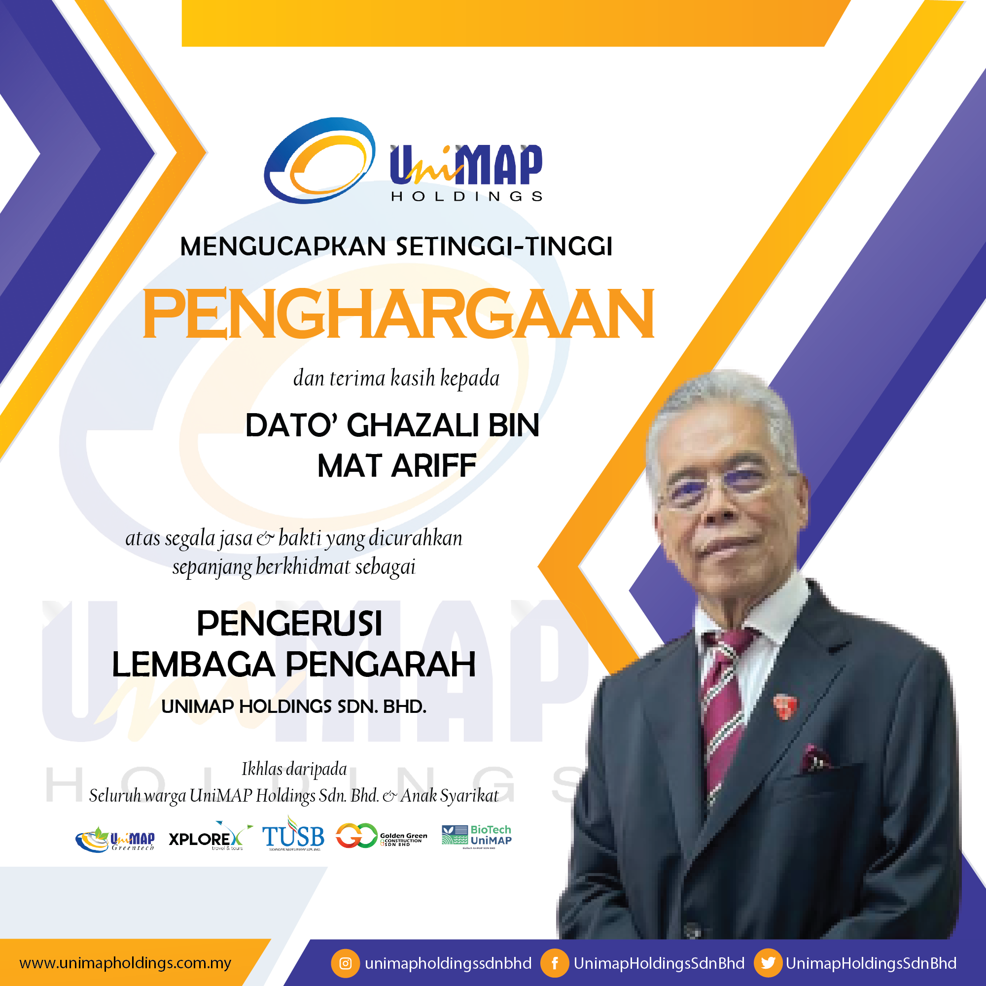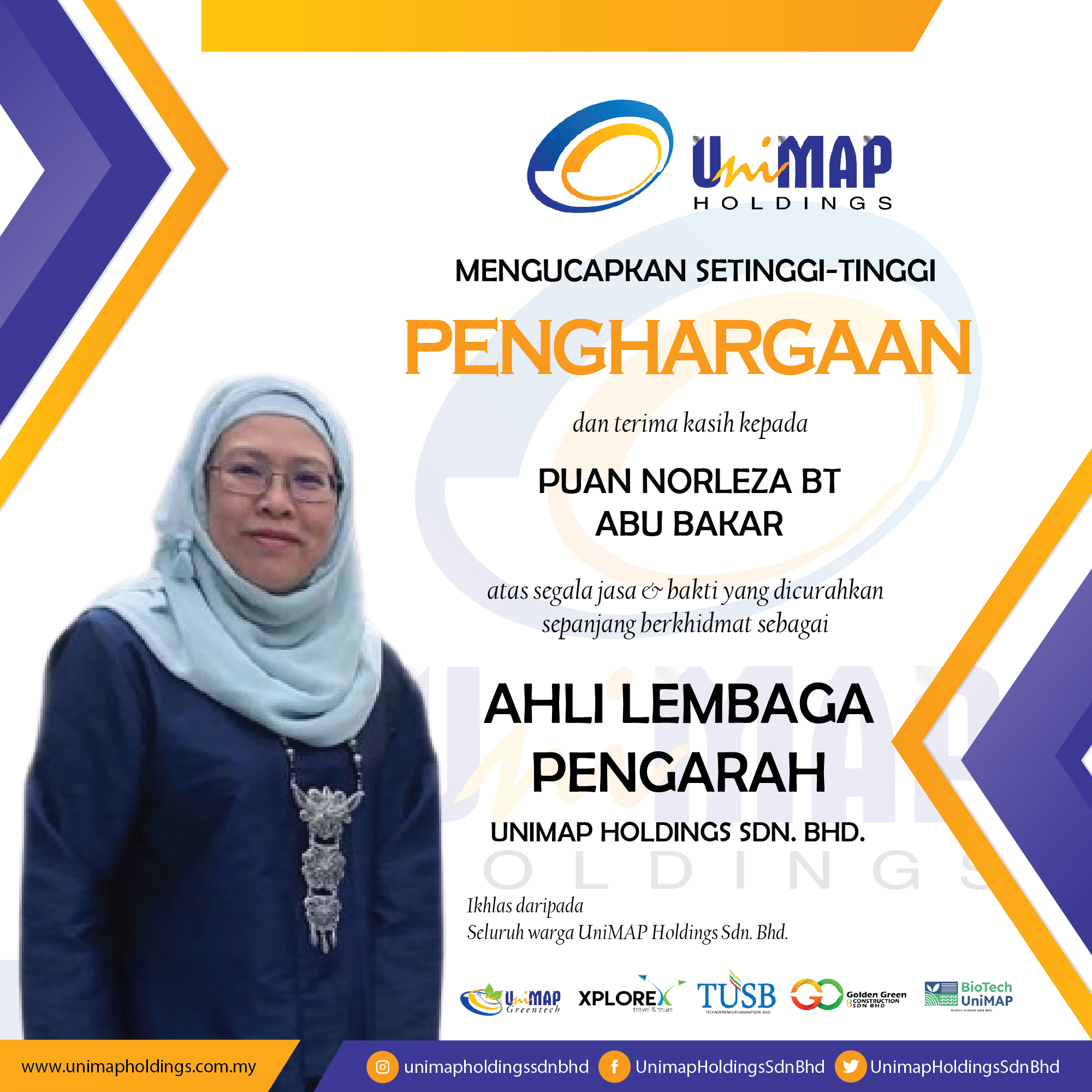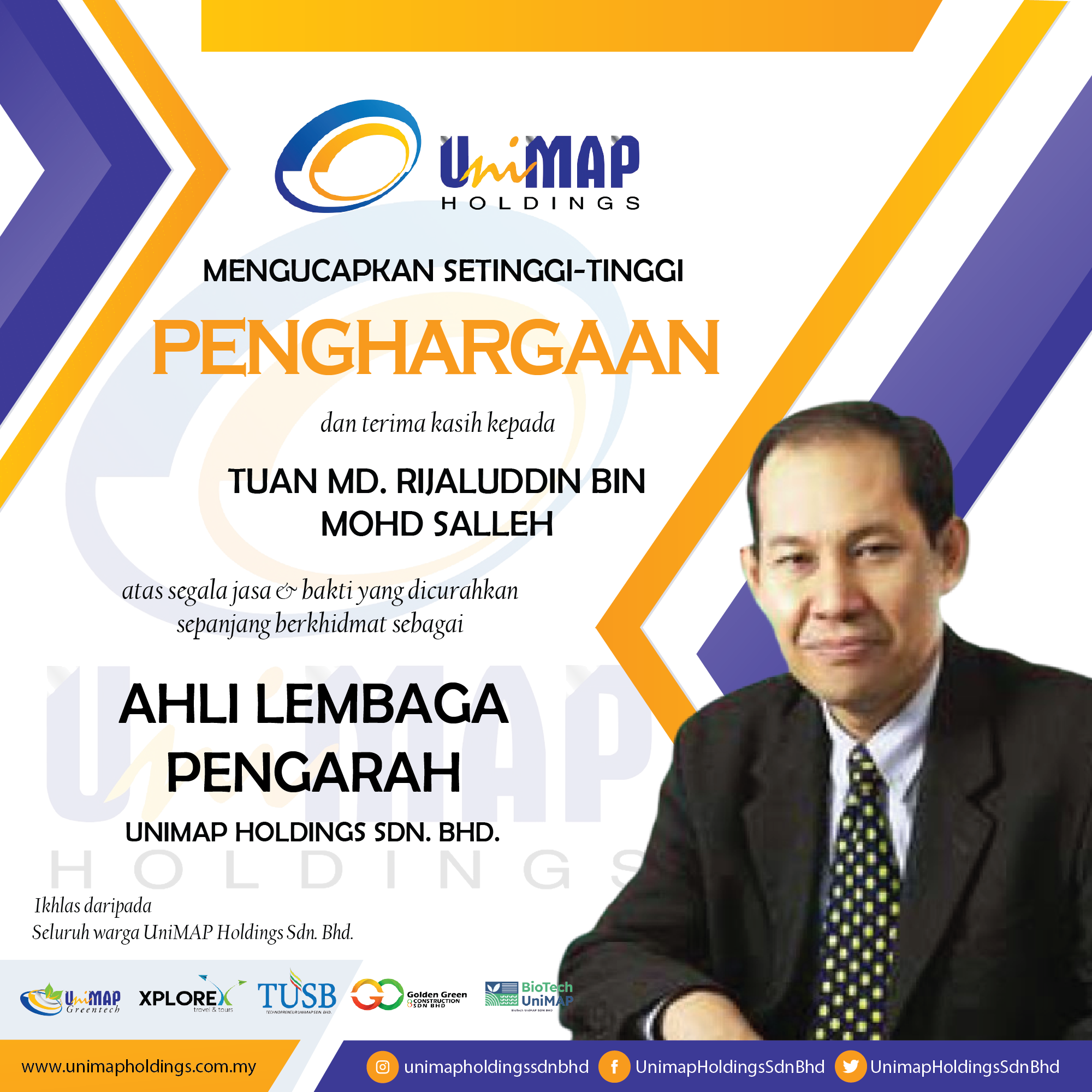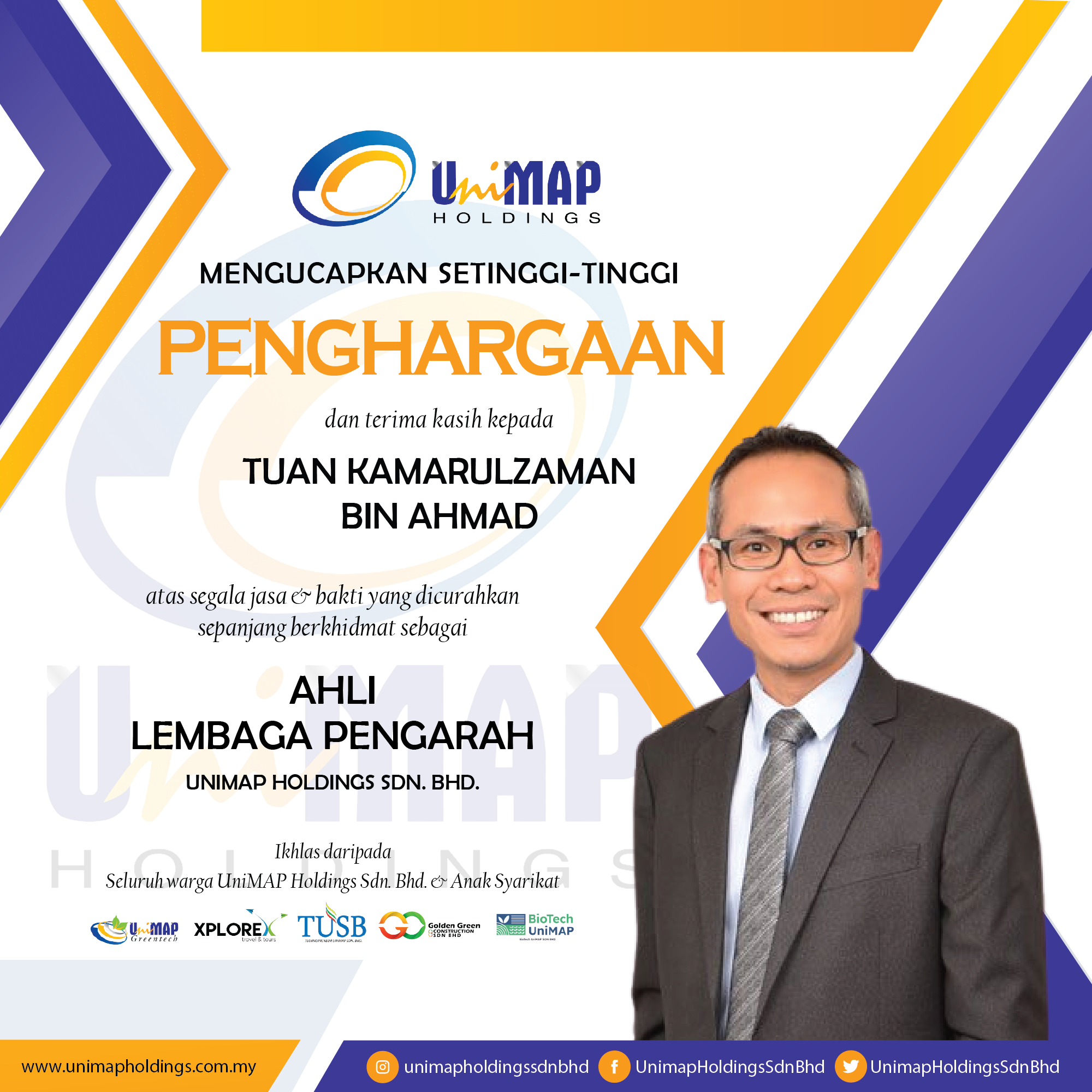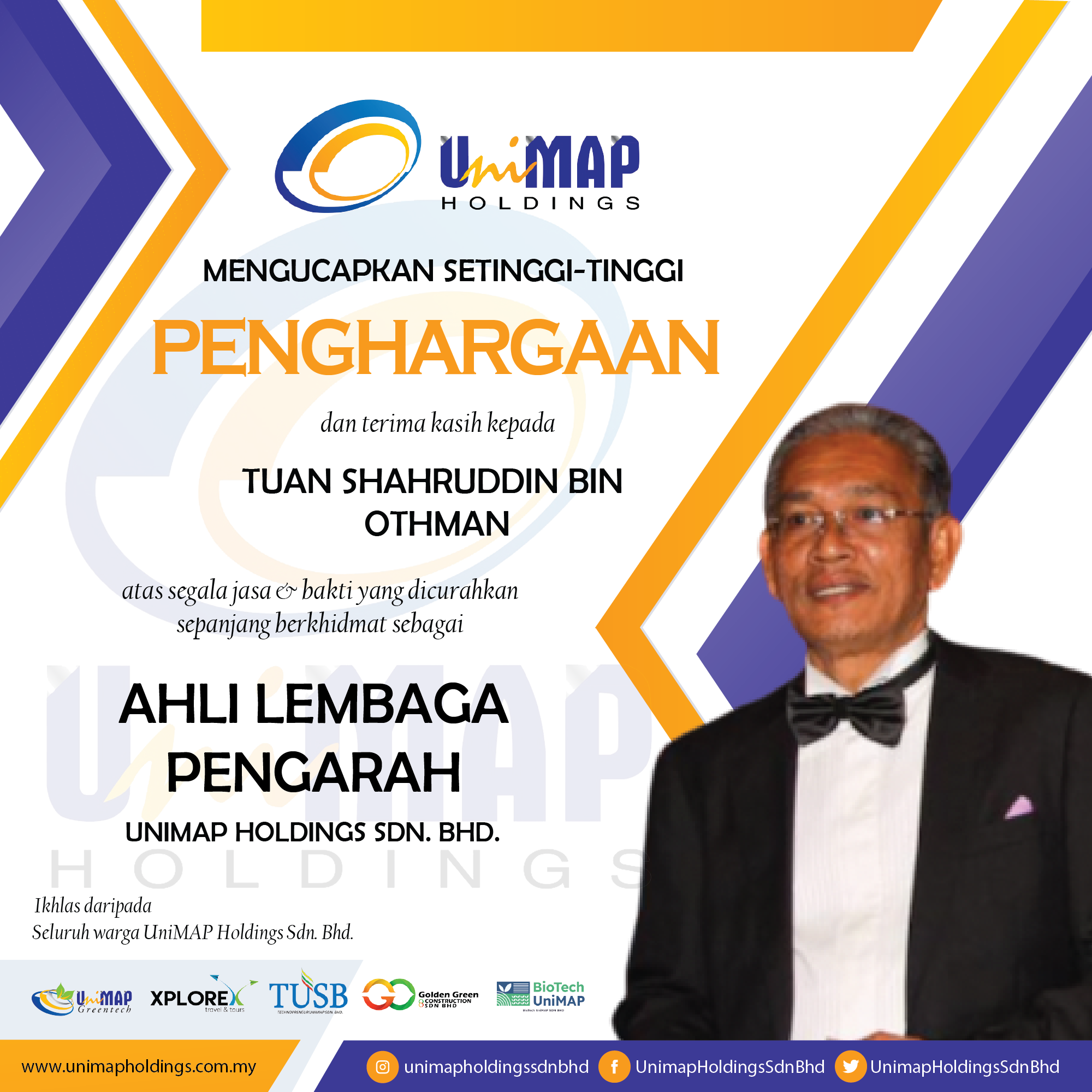 UNHSB mengucapkan setinggi-tinggi penghargaan dan terima kasih kepada Tuan Kamarulzaman Bin Ahmad atas segala jasa dan bakti yang dicurahkan sepanjang berkhidmat sebagai Ahli Lembaga Pengarah, UniMAP Holdings Sdn. Bhd. (UNHSB)